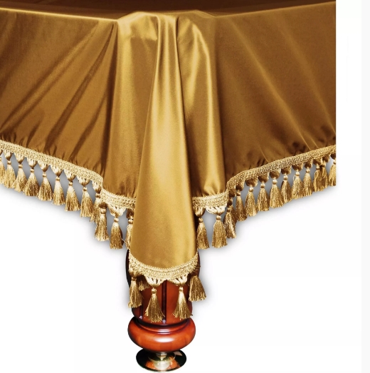 Данное покрывало изготовлено из шелка с проходящей по краю бахромой. В целом, процесс игры на бильярдном столе начинается именно с того, что со стола убирают красивое и дорогое покрывало с кисточками по краям. Сейчас же такие покрывала приобретаются не только для красоты, но еще и для выполнения основных функций. Покрывало выполняет функцию защиты бильярдного стола от пыли, влажности и грязи.